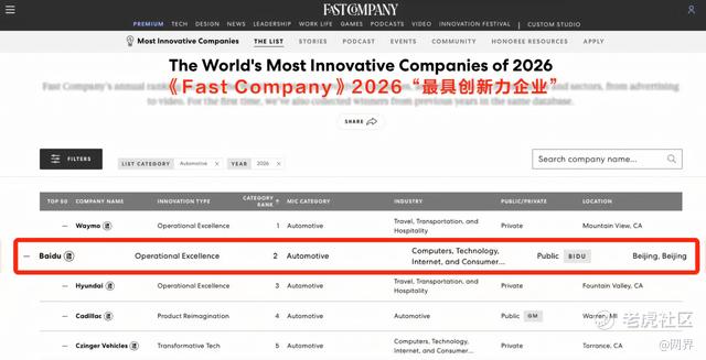 3月24日,《Fast Company》公布2026年“最具创新力企业”,萝卜快跑拿下汽车领域全球第二,而且是唯一进入前三的中国企业。