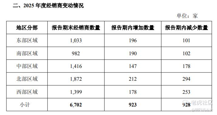 2025年,公司新增经销商923家,减少928家,净减少5家,截至报告期末经销商总数为6702家。这是经销商数量连续第三年处于调整通道。