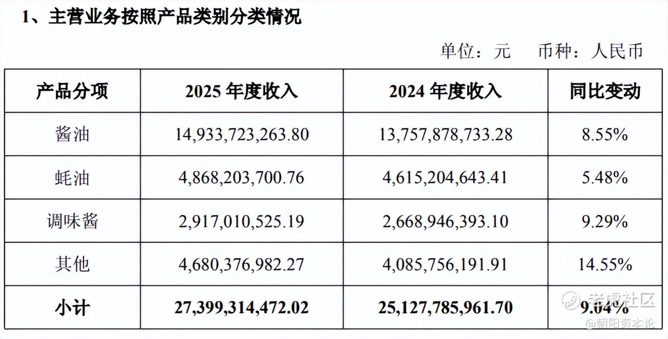 说到底,这是一家靠“三大件”撑起来的公司。2025年,酱油实现营收149.34亿元,占总营收的51.7%,同比增长8.55%;蚝油营收48.68亿元,同比增长5.48%;调味酱营收29.17亿元,同比增长9.29%。三大品类加起来贡献了超过82%的收入。