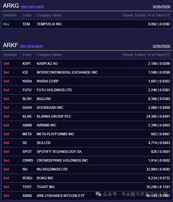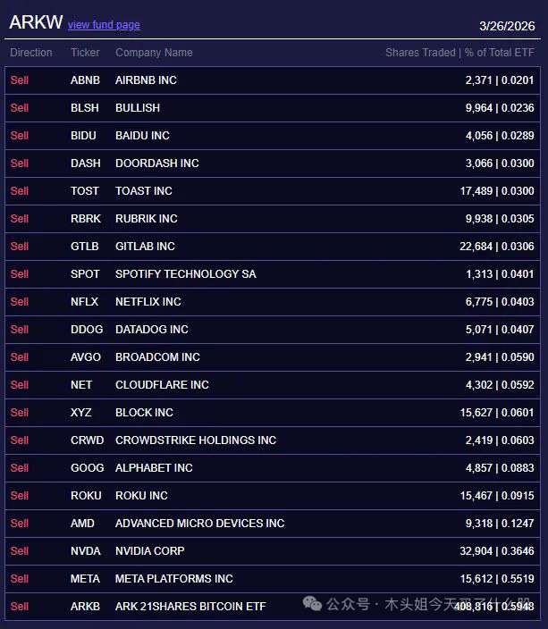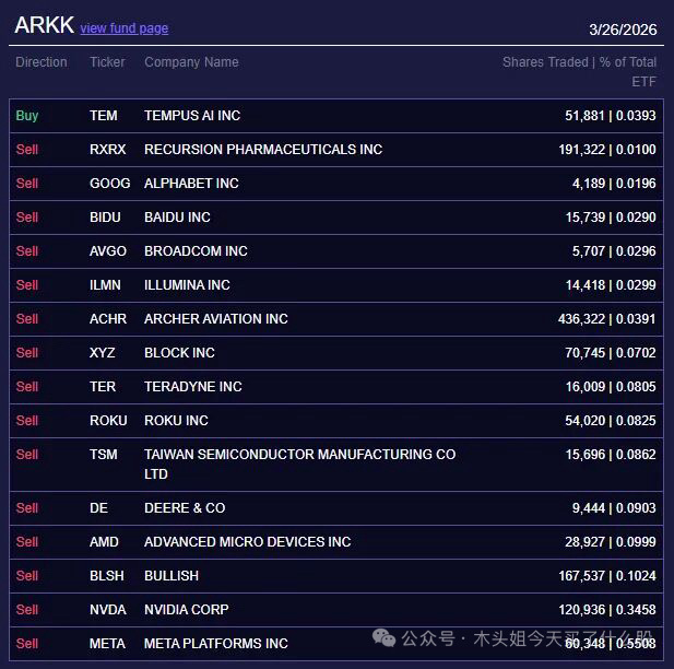 卖出60万美元RXRX、250万美元谷歌、220万美元百度、270万美元博通、180万美元ILMN、230万美元ACHR、520万美元XYZ、480万美元TER、670万美元ROKU、520万美元TSM、550万美元DE、780万美元AMD、650万美元BLSH、2700万美元英伟达、4200万美元脸书、62万美元ABNB、77万美元DASH、140万美元TOST、46万美元RBRK、47万美元GTLB、100万美元SPOT、63万美元NFLX、63万美元DDOG、90万美元NET、136万美元CRWD、1000万美元ARKB、15万美元KSPI、23万美元ICE、30万美元富途、31万美元KLAR、38万美元SE、46万美元NU。这两天卖的的确是有点多,再加上要周末了,这是要提前避险吗。