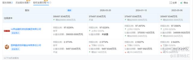 2024年1月,山西金控首次对山西再担保增资2亿元,注册资本由35.95亿元增至37.95亿元。本次再度增资2亿元,两次累计补充资本金4亿元,持股比例提升至97.62%,进一步巩固了控股地位。