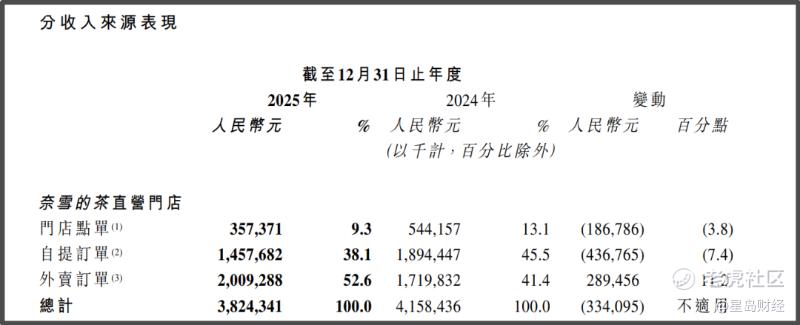 从收入来源看,奈雪的茶的营收结构已发生变化。其2025年来自外卖订单的收入为20.09亿元,同比增长11.2%,占直营门店总收入比例由上年41.4%大幅提高至52.6%,而来自自提订单和门店点单的收入则分别同比减少7.4%和3.8%。