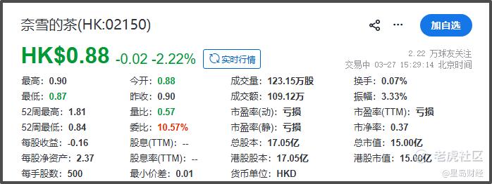 截至3月27日收盘,奈雪的茶港股报0.88港元/股,下跌2.22%,总市值15亿港元。