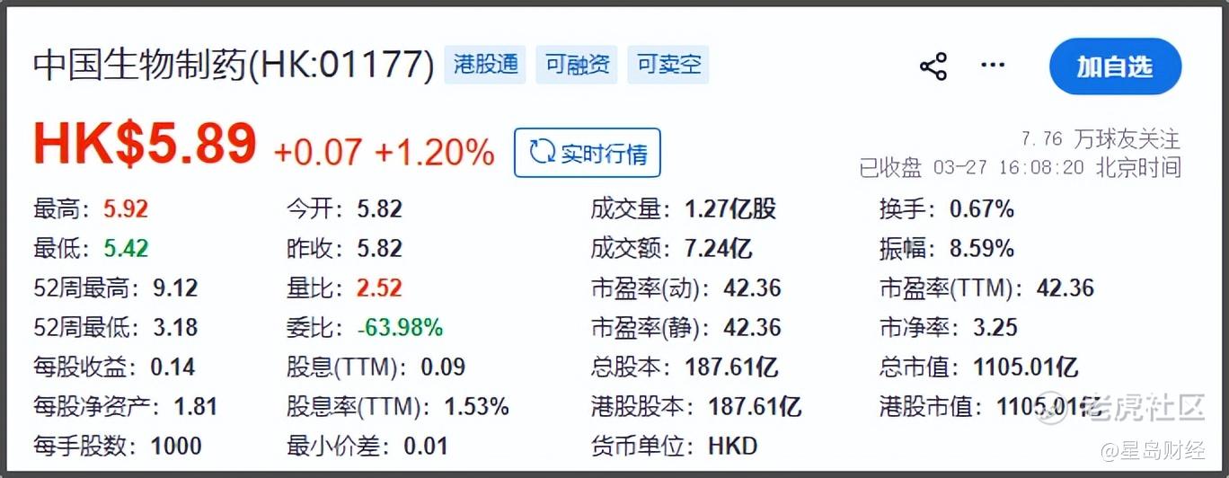 截至3月27日收盘,中国生物制药港股报5.89港元/股,微涨1.2%,总市值1105.01亿港元。