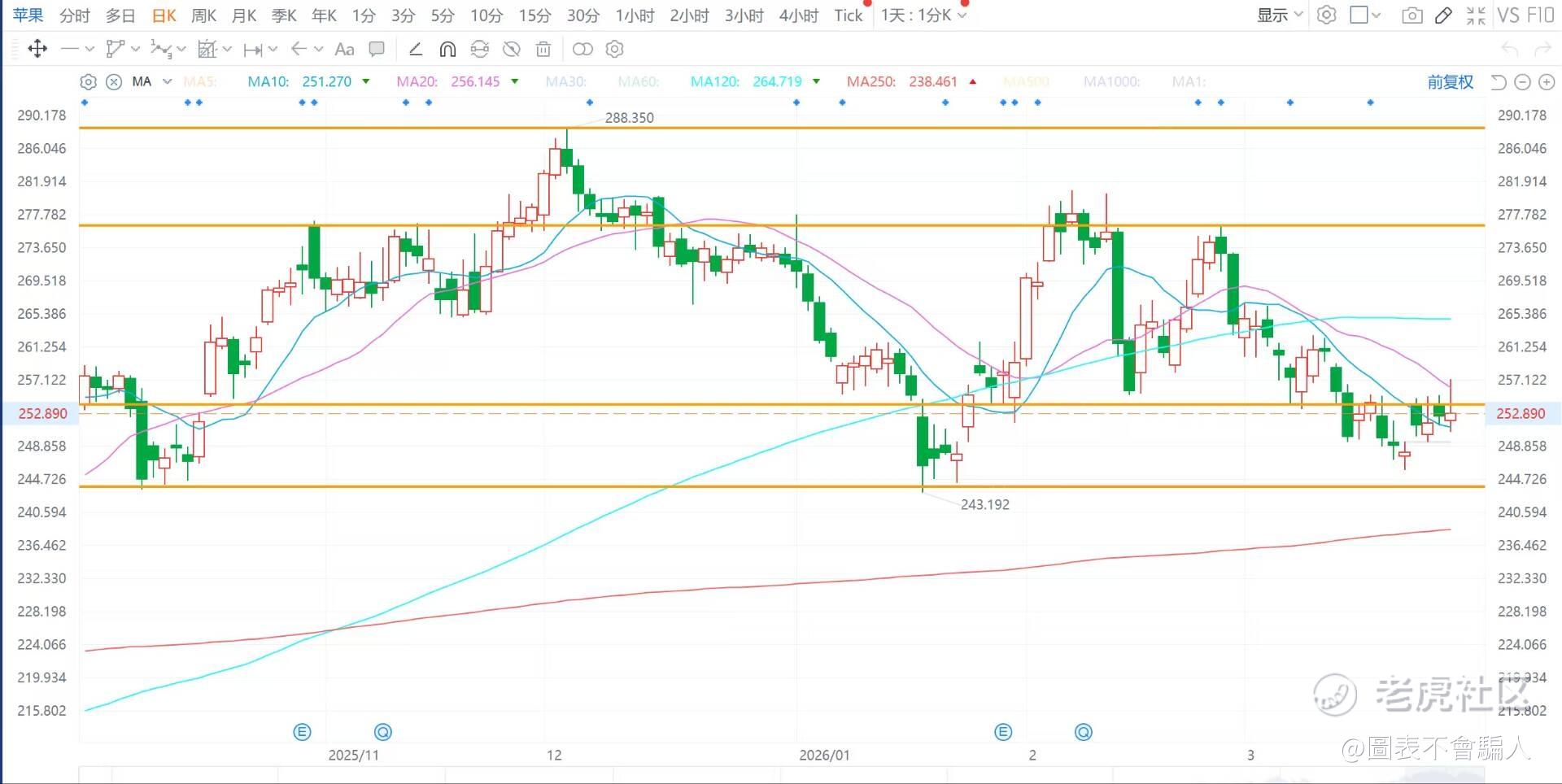 苹果 (AAPL):收涨0.11%,为数不多涨了的股,前段时间走了个M头,不知道后面会不会触底反弹,支撑参考243/254,阻力参考276/288