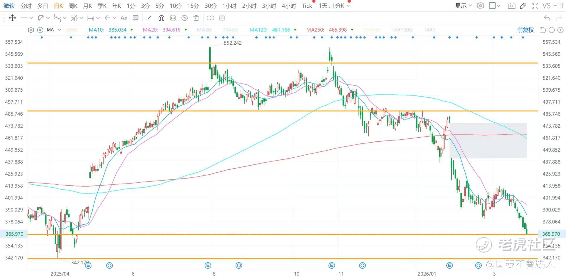 微软(MSFT):收跌1.37%,这段时间一直再跌,不知道有没有反弹的机会,支撑参考340/363,阻力参考488/536