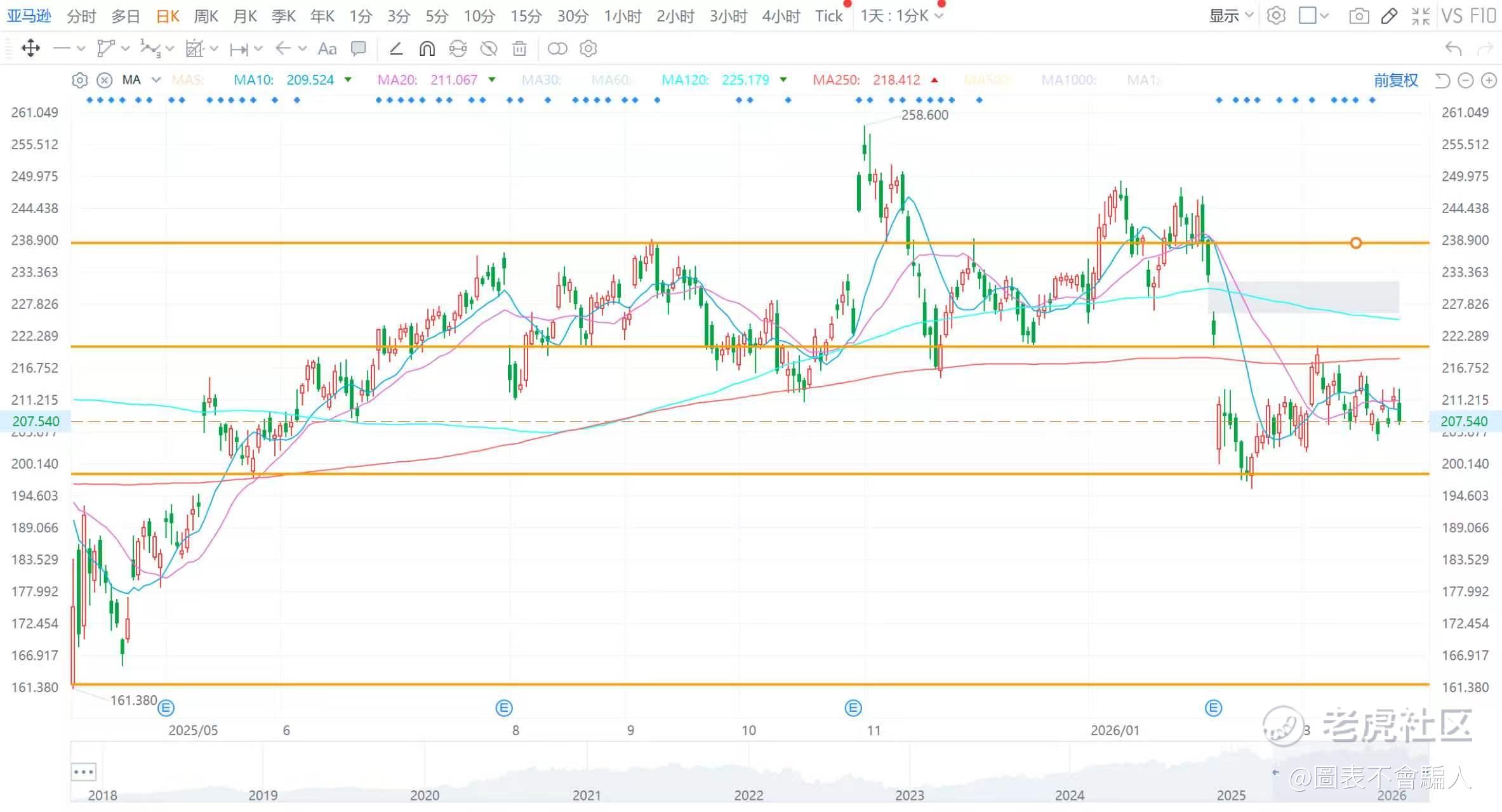 亚马逊(AMZN):收跌1.97%,年初跳空后就处于区间震荡,支撑参考161/198,阻力参考220/238