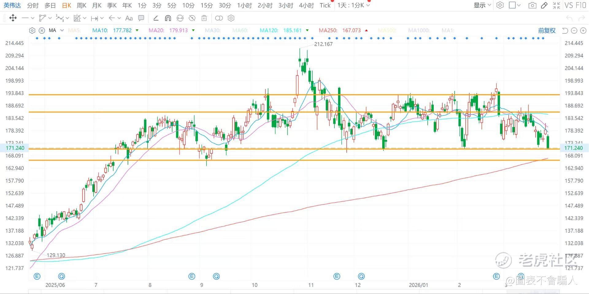英伟达(NVDA):收跌4.16%,仍然是区间震荡,目前踩在支撑位,看看后期会不会突破,支撑参考166/171,阻力参考186/193