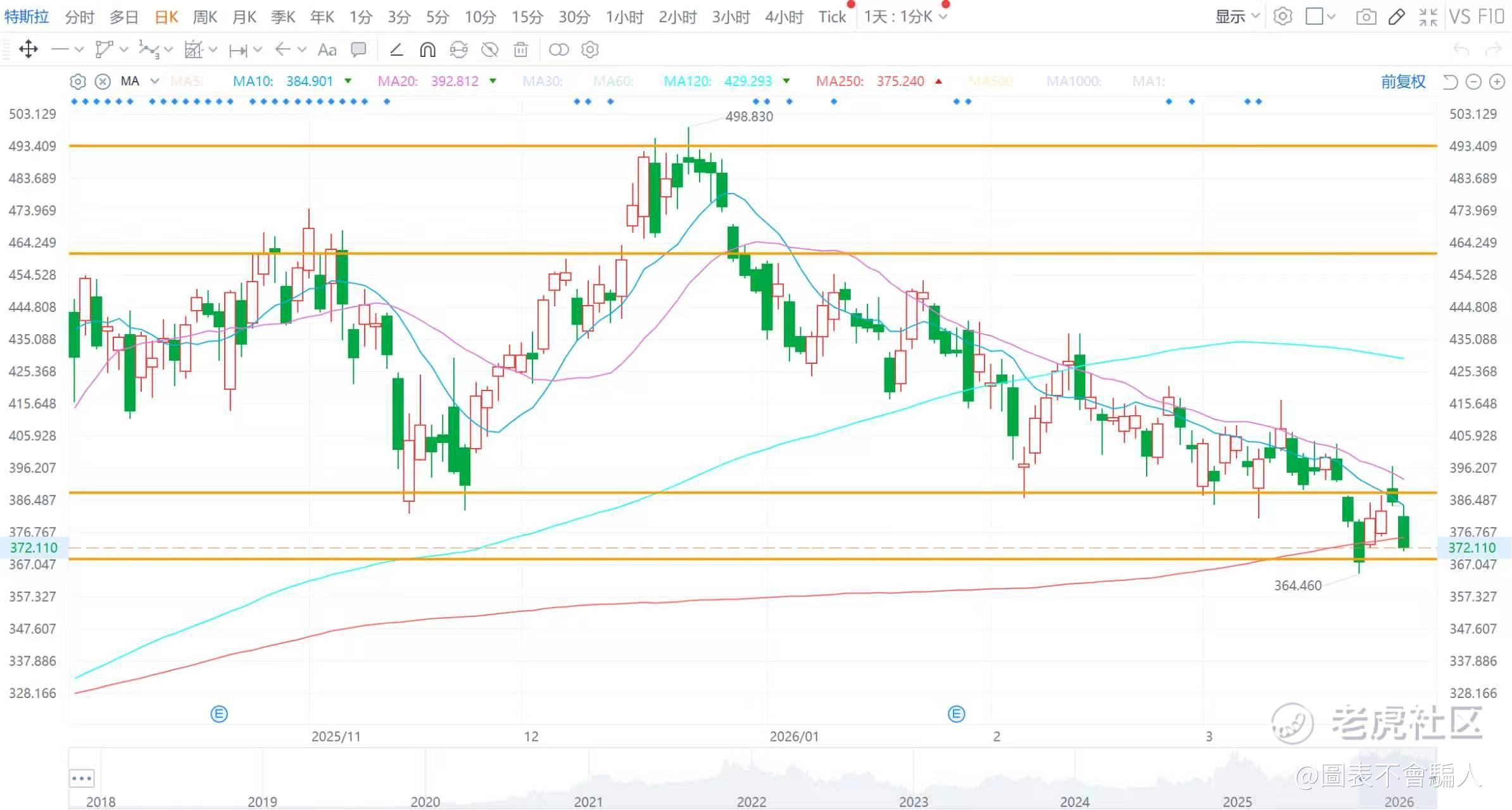 特斯拉(TSLA):收跌3.59%,依旧是下行趋势时的震荡,前段时间小涨后跌回来了,支撑参考368/388,阻力参考460/492