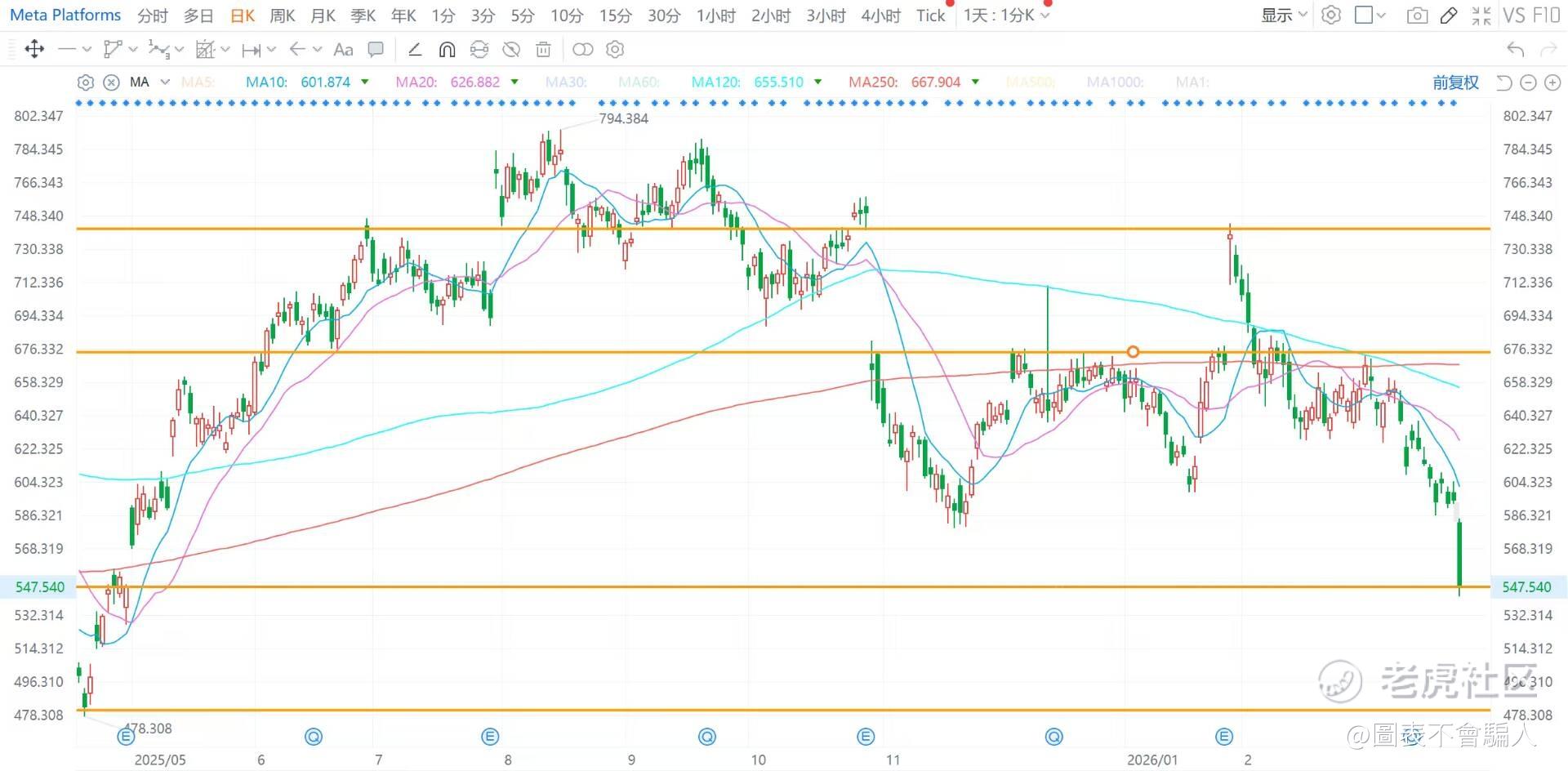 Meta Platforms (META):收跌7.96%,利润被拿去扩大对ai数据中心建设,AI商业化能力还是未知,这么多年来meta到底做成了什么市场?支撑参考481/546,阻力参考675/740