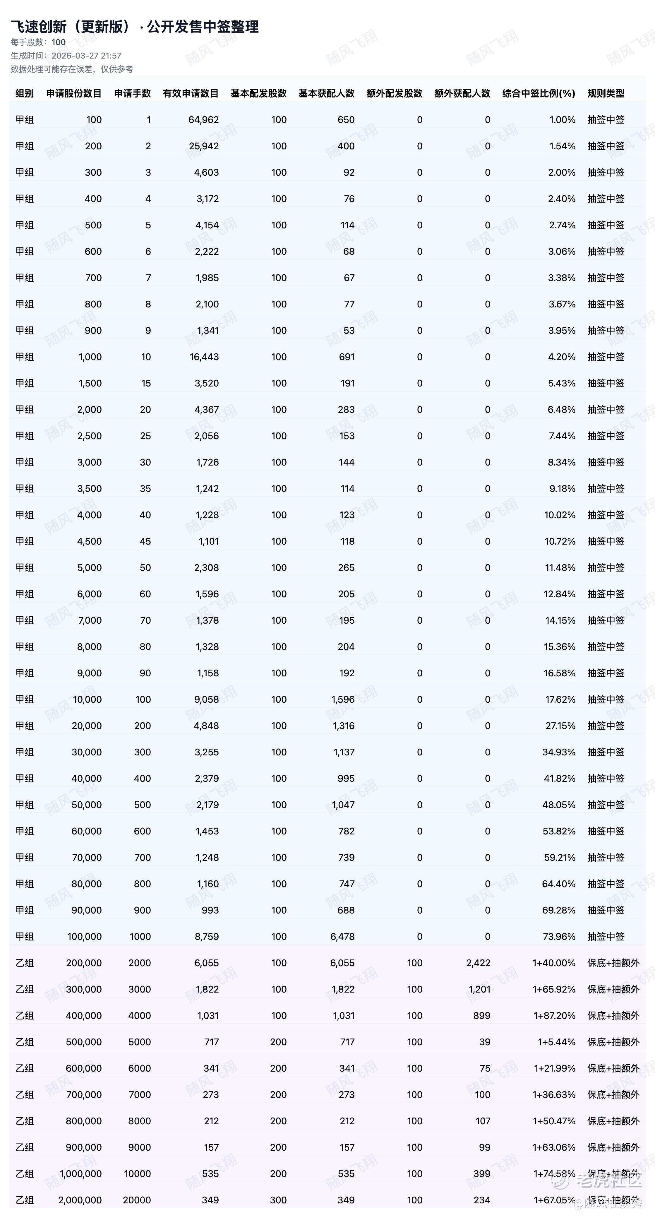 哈哈哈哈,飞速创新刚刚在港交所发布“澄清公告”,确认之前的乙组配发数据是不对的,并进行了修正……更新后的各档位中签率数据如下,乙组即可稳一手。