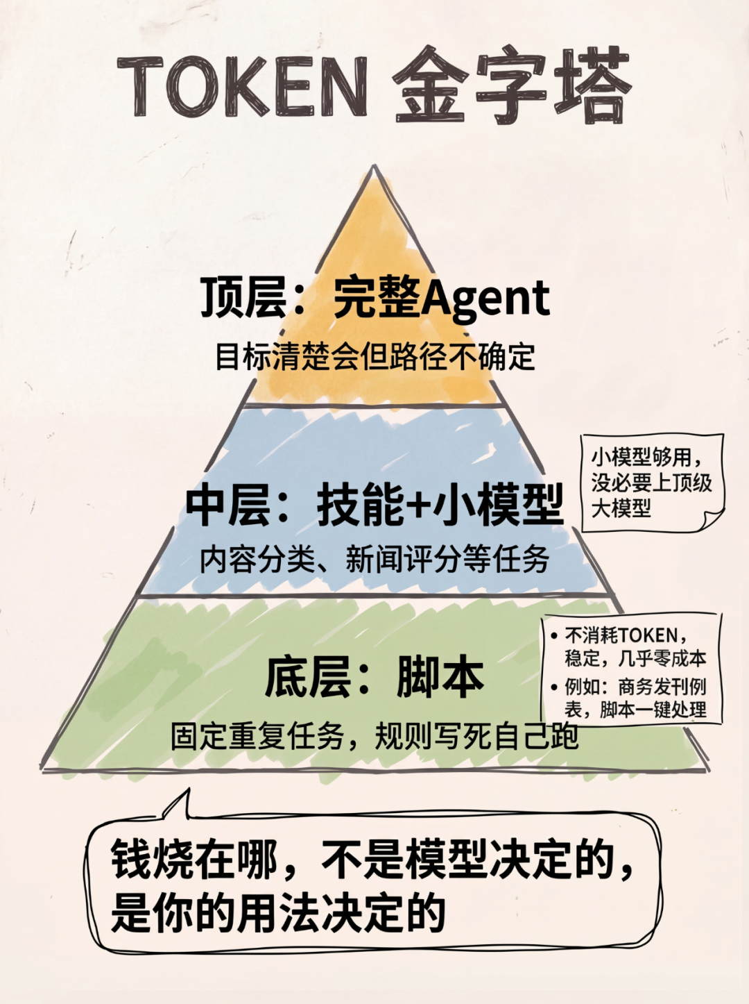 底层:脚本。 固定的、重复的任务,规则写死,让它自己跑,不消耗TOKEN,稳定,便宜。商务发刊例表之类的工作,脚本一键处理,几乎零成本。