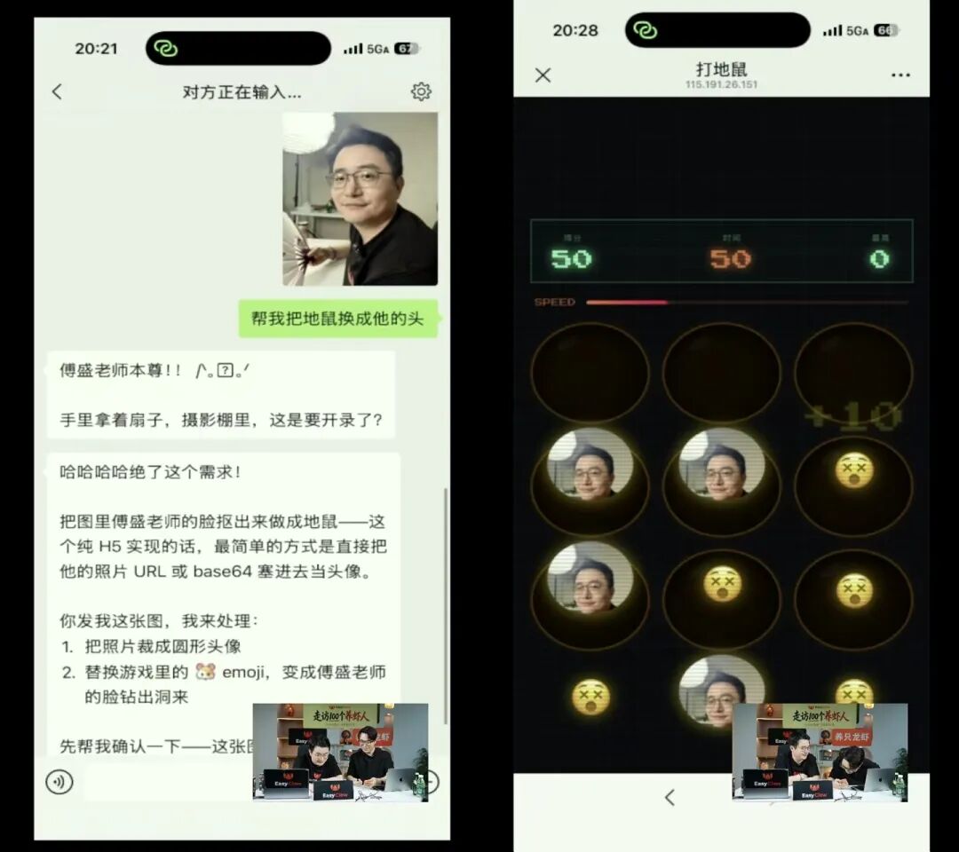 他现场让龙虾做了个打地鼠游戏,把我的头P进去当目标,全场笑喷,抽象到我都想当场掐掉。