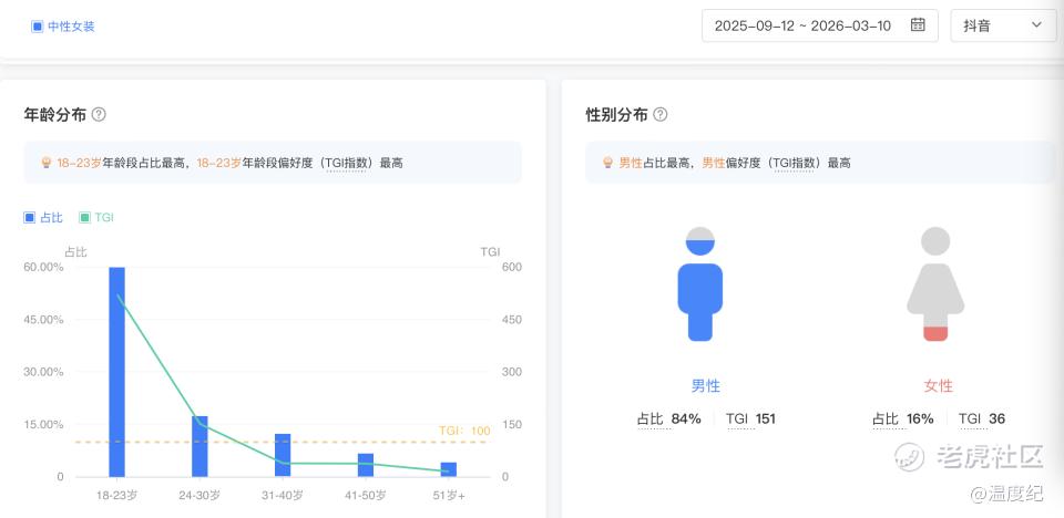 近半年来,抖音搜索穿搭的人群中,有49%的占比为男性,大多是18-23岁的年轻人。并且,一个出乎大多数人意料的数据是,搜索“中性女装”的人群,男性占比竟然高达84%。“凭什么穿衣自由只有女人才配?”很明显,不甘被刻板印象禁锢的普通消费者,正在偷偷尝试着打破服装的性别界限。