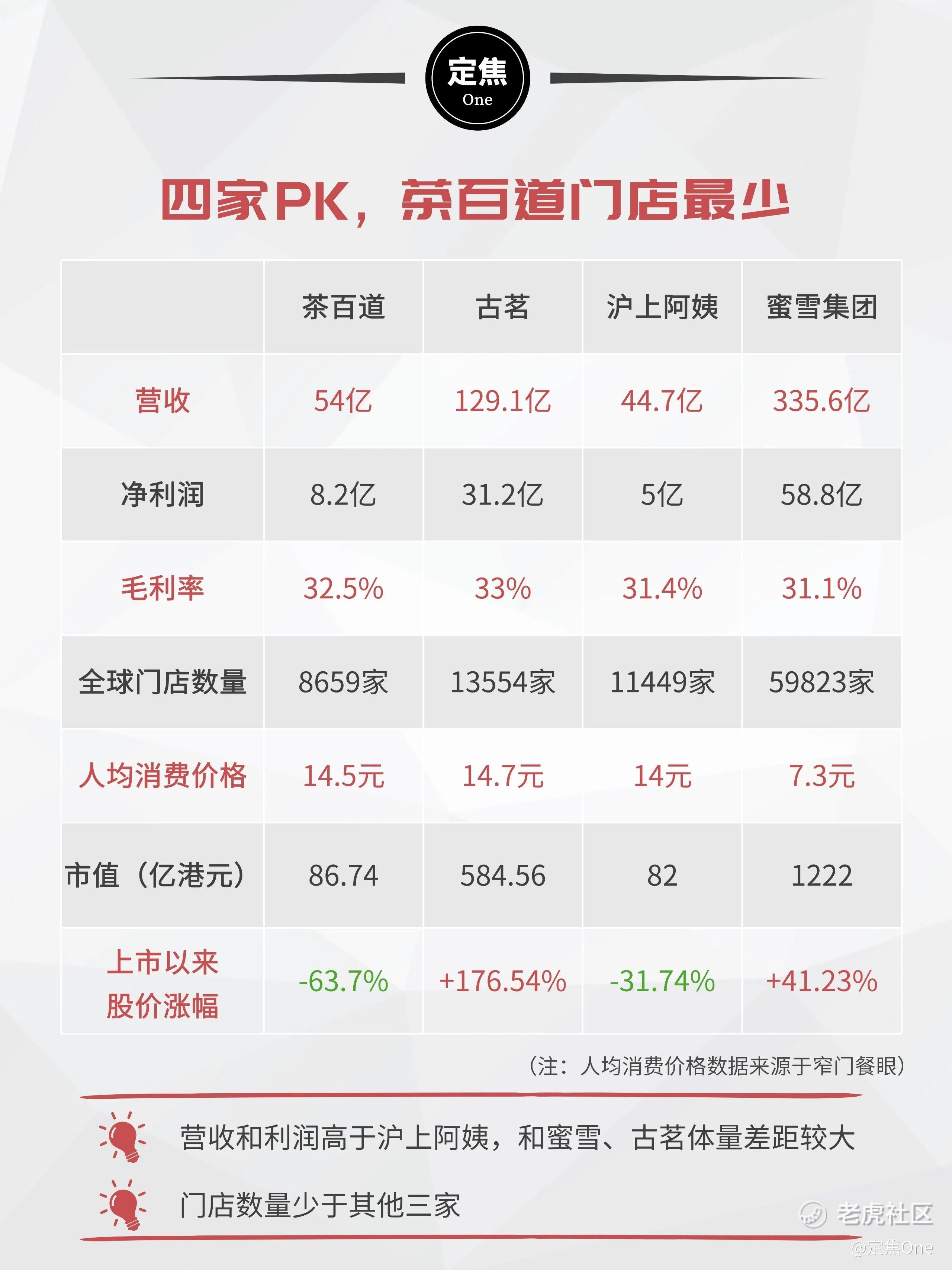 与古茗、沪上阿姨、蜜雪冰城等对手相比,茶百道的门店总数在四家中最少,尚未破万。在营收、利润体量上,茶百道略优于沪上阿姨,但与蜜雪、古茗差距较大。资本市场也给出了类似反馈,其市值与沪上阿姨接近。