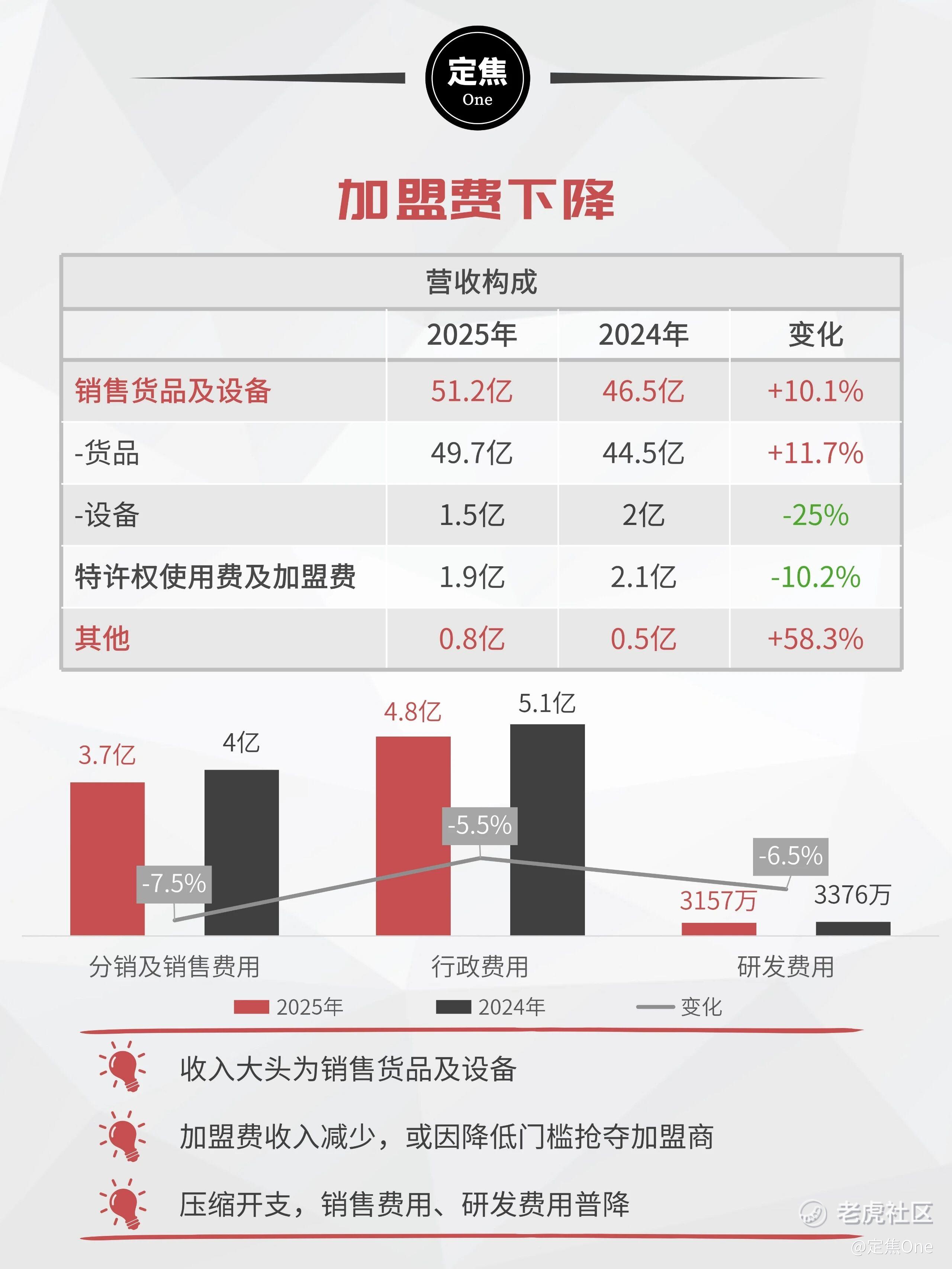 再看收入结构,占总收入94.9%的“销售货品及设备”是绝对主力,其中货品销售同比增长11.7%,设备销售收缩25%。与此同时,特许权使用费及加盟费收入下降了10.2%。