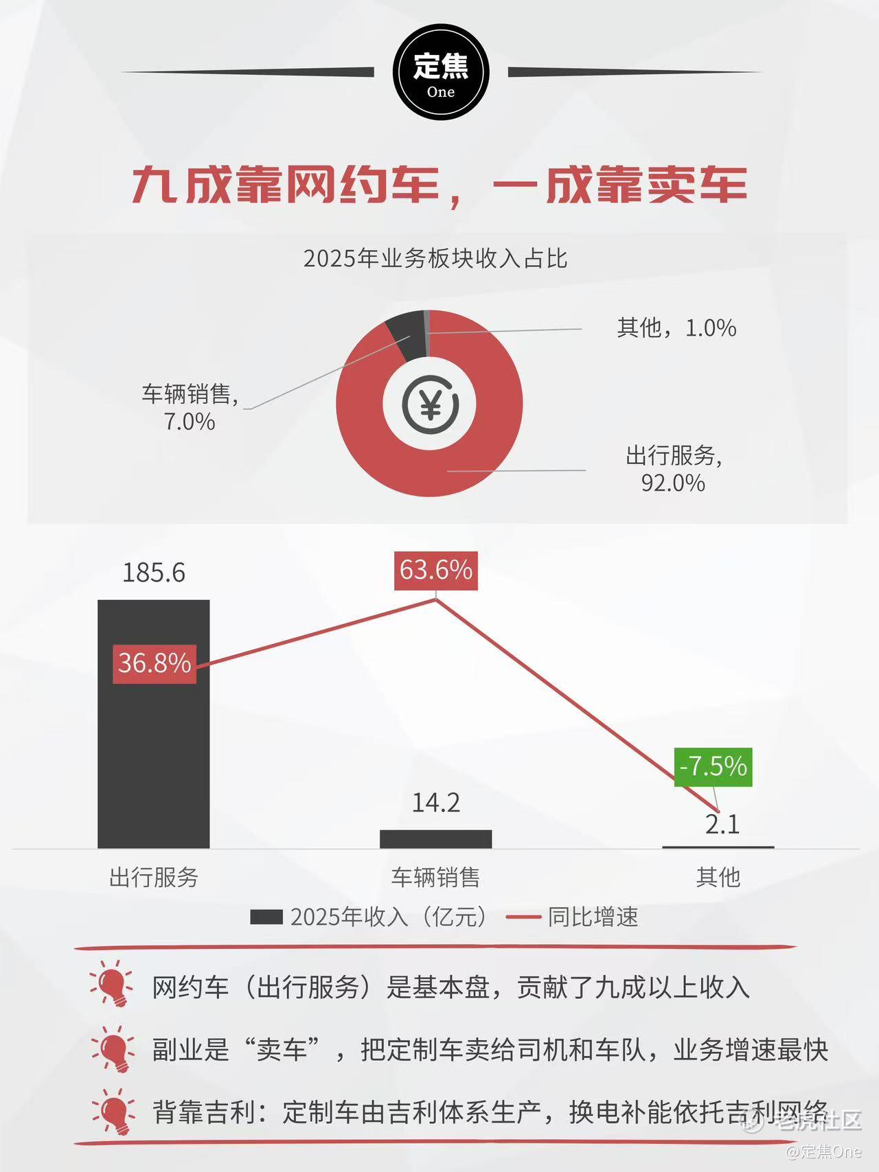 曹操出行有两大核心收入。一是网约车服务,一年进账185.6亿元,占了总收入的92%。二是“卖车”,背靠吉利,把专门定制的网约车卖给运力合作伙伴和个人司机。“卖车”业务2025年卖了超1.5万辆车,收入14.2亿元,同比增长63.6%。