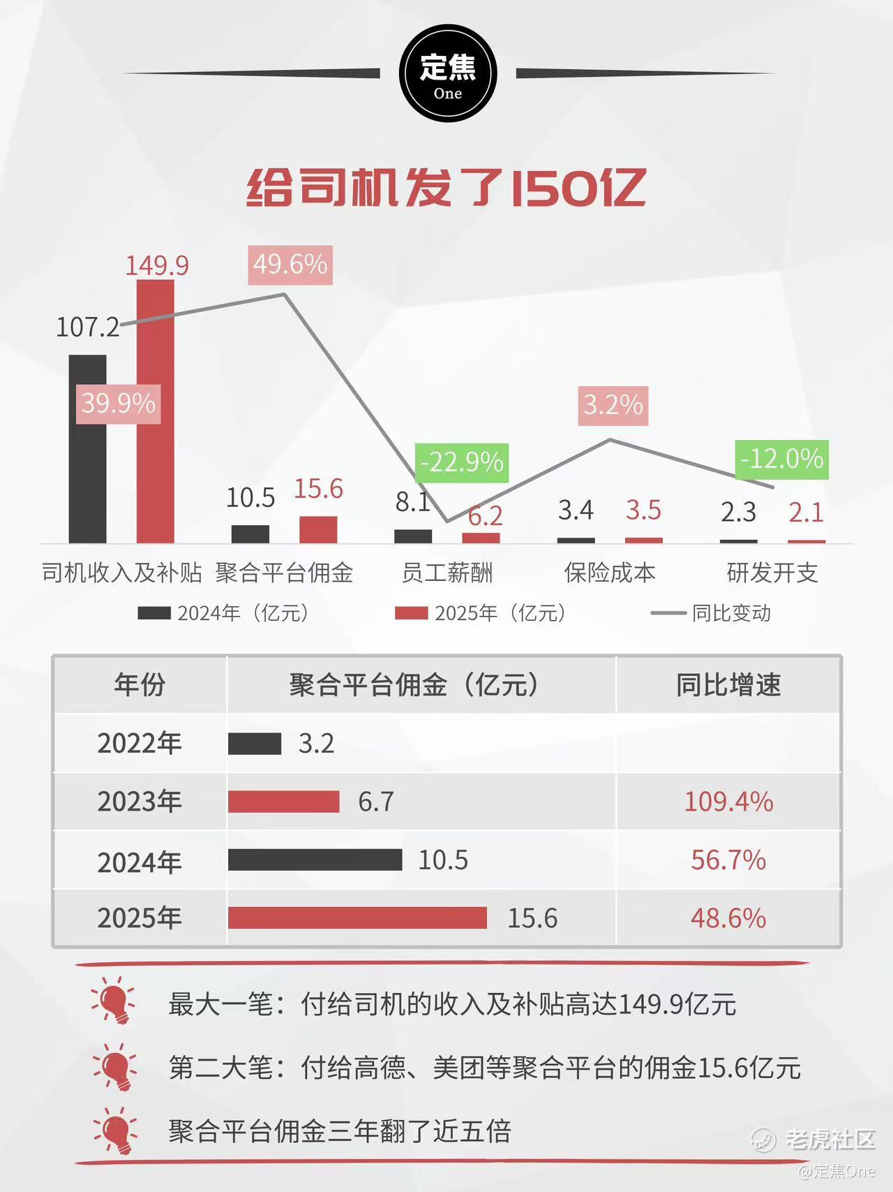 曹操出行最大的成本是给司机的分成和补贴,2025年这笔钱达149.9亿元。另一笔开销,支付给聚合平台的佣金高达15.6亿元,同比增长49.6%,增速超过出行服务收入(36.8%)。
