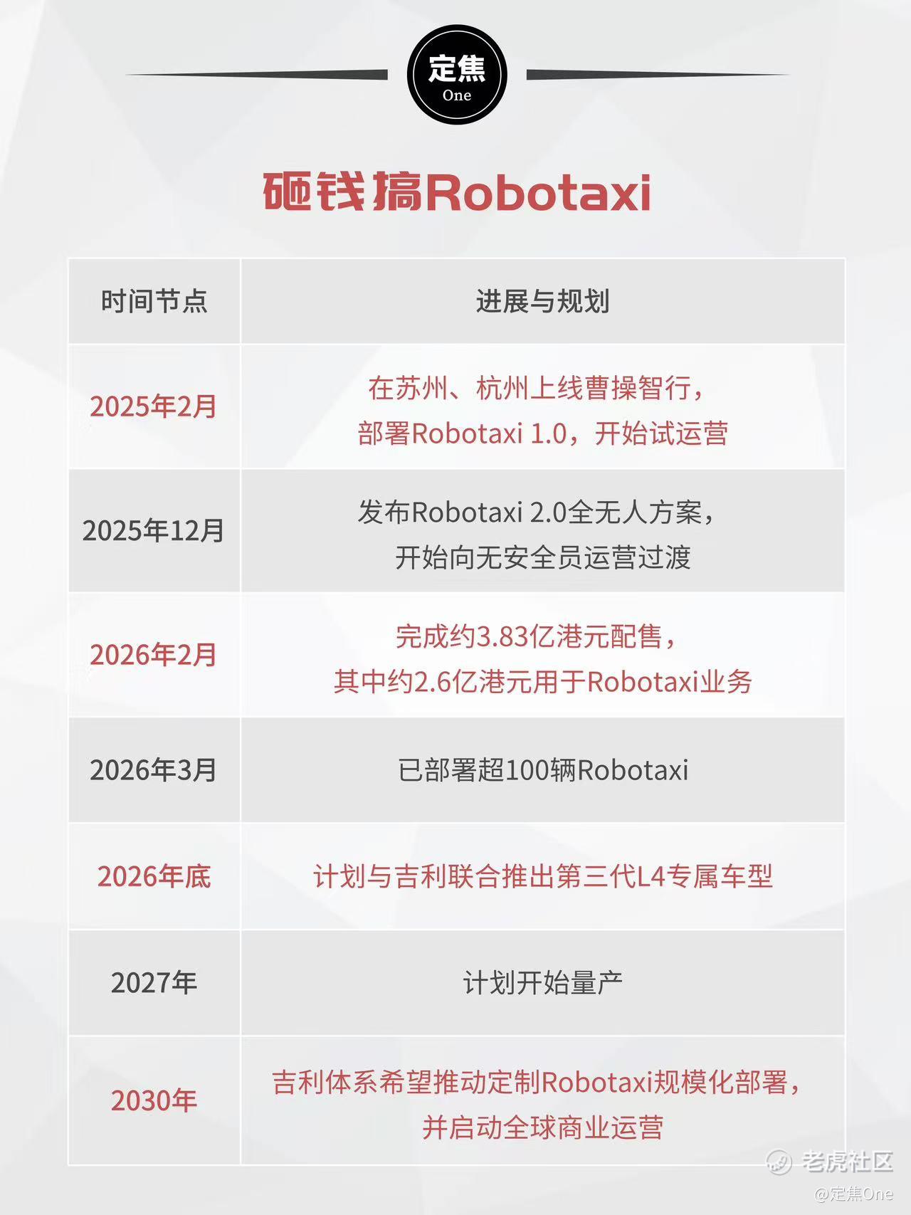 这份财报有相当多的篇幅在谈Robotaxi(无人驾驶出租车),包括2025年2月在苏州、杭州开始试运营,12月推出全无人方案。截至财报发布,已部署超100辆。2026年底,其计划与吉利联合推出为Robotaxi设计的第三代L4车型,2027年量产。