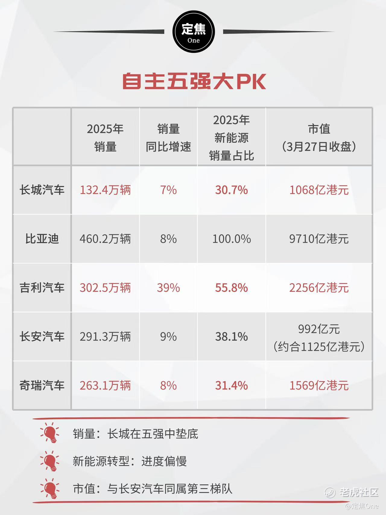 放在自主五强的大盘子里看,长城的体量最小;市值与长安汽车同属千亿级别的第三梯队,和比亚迪、吉利拉开了明显差距;新能源渗透率30.7%也是五强中最低的,且高度依赖插混,纯电板块亟待破局。