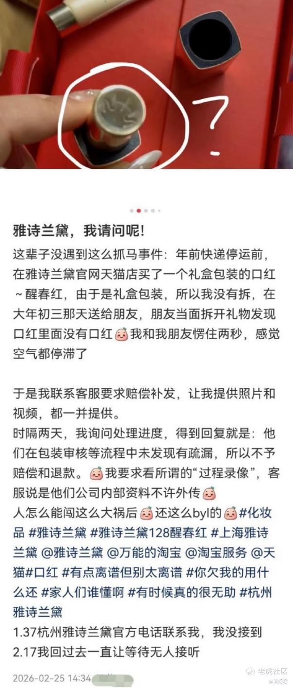 花360元在雅诗兰黛官方旗舰店买口红,拆开却是空空的外壳,满心期待沦为尴尬。