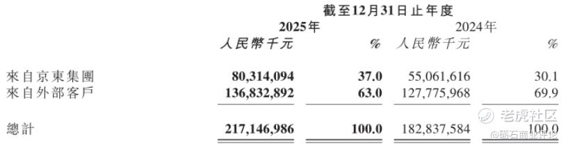 按照客户类别划分,京东物流客户又可以划分为京东集团以及外部客户两大类。2025年,京东物流来自京东集团的收入为803亿元,同比增长46%,收入占比为37%。同期,公司来自外部客户的收入为1368亿元,同比增长7.1%,收入占比为63%。