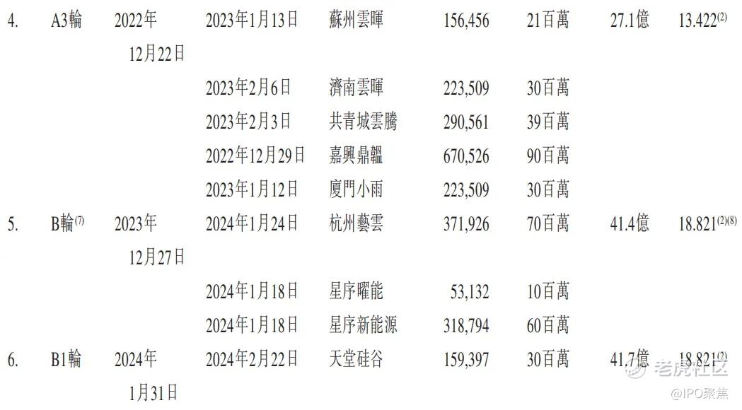 思格新能源成立于2022年5月,由前**智能光伏业务总裁许映童创立。据悉,许先生曾带领**光伏逆变器业务登顶全球第一。据招股书,从2022年至2024年,公司累计进行了6轮融资,累计融资金额为7.15亿元,投资方包括高瓴创投、华登国际、钟鼎资本、云晖资本、天堂硅谷、国科东方等。截至2024年1月完成的B1轮融资后,公司的投后估值达到41.7亿元,为首轮投后估值的约42倍。