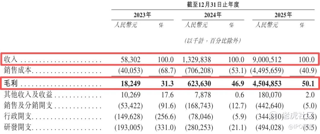 相似地,公司的毛利也在快速提升,从2023年至2025年,分别为1825万元、6.2亿元及45.0亿元,复合年增长率为1471.2%,对应的毛利率分别为31.3%、46.9%及50.1%。