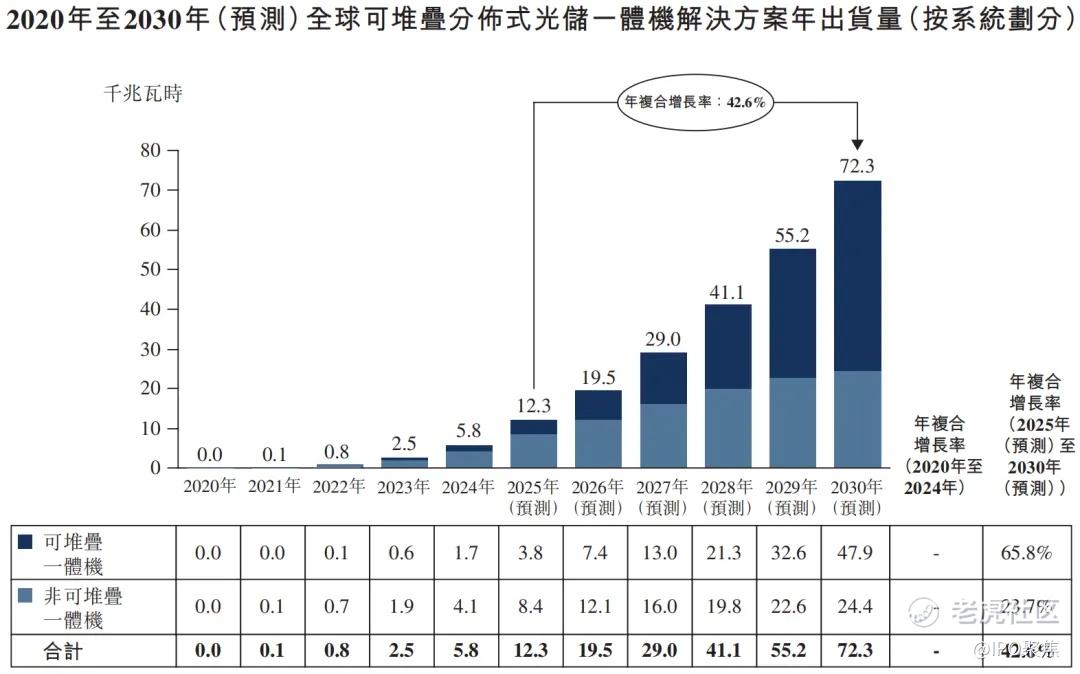 据弗若斯特沙利文数据,全球可堆叠分布式光储一体机解决方案的市场规模快速增长。按出货量计算,其市场规模从2020年的小于100兆瓦时提升至2024年的5800兆瓦时,后续预计将以42.6%速度增至2030年的7.2万兆瓦时。