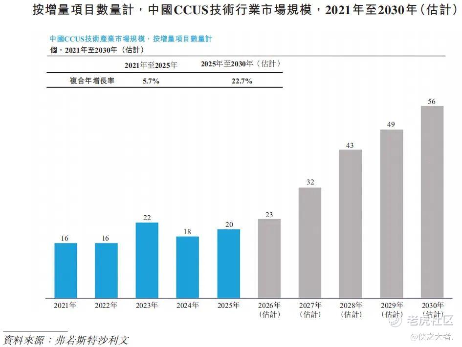 根据弗若斯特沙利文(Frost & Sullivan)的报告,在中国,CCUS项目发展迅速。2021年当年新增了16个CCUS项目。近年来,新增项目数量持续增长。到2025年,新增项目数量已增至20个。预计到2030年,项目数量将增加至56个。