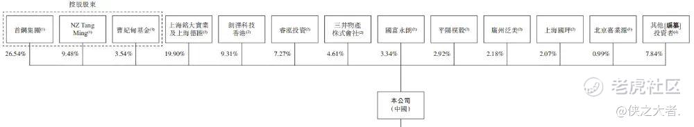 首钢集团直接持股约26.54%,NZ Tang Ming直接持股约9.48%,曹妃甸基金直接持股约3.54%。首钢集团、NZ Tang Ming及曹妃甸基金连同董女士、Ye女士、昌发展新元及首程融石组成一组控股股东,合计持股约39.56%。