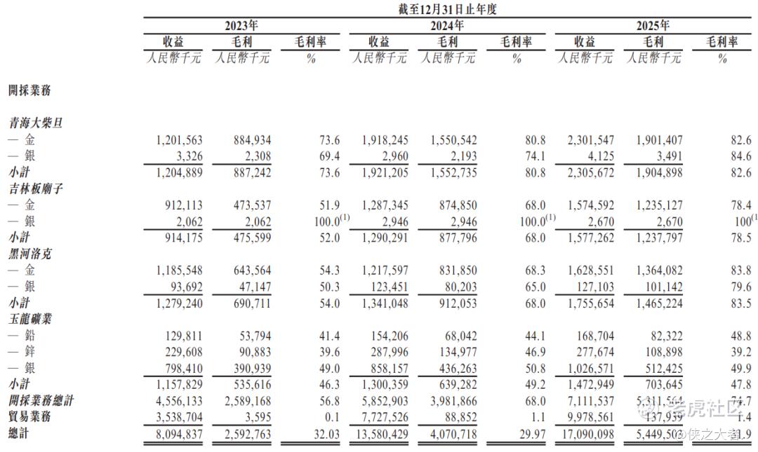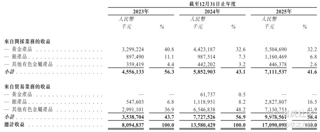 公司收入主要来自开采业务与贸易业务两大板块,其中贸易业务为收入的重大组成部分,2025年占总营收比重达58.4%,且以其他有色金属产品、银产品贸易为核心;开采业务中黄金产品是主要收入来源,2025年占比32.2%。