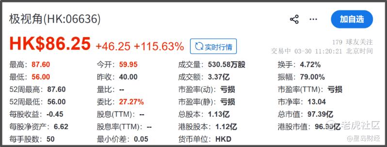 3月30日,山东极视角科技股份有限公司(06636.HK)正式在港交所主板上市,以59.95港元/股高开,随即一路上扬。截至11时20分左右,极视角报86.25港元/股,上涨115.63%,总市值97.39亿港元。
