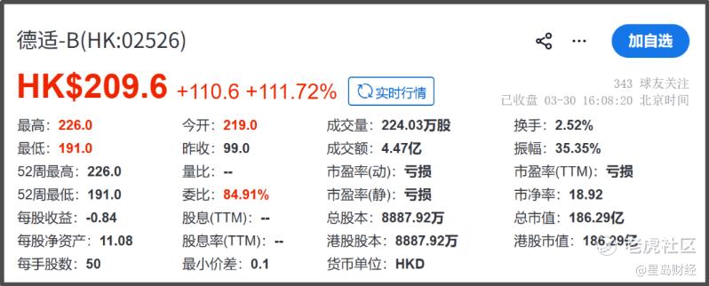 3月30日正式挂牌后,德适生物一路高开高走,盘中涨幅一度超124%,股价触达222港元/股,截至当日收盘,股价报209.6港元/股,涨幅111.72%,总市值186.29亿港元。
