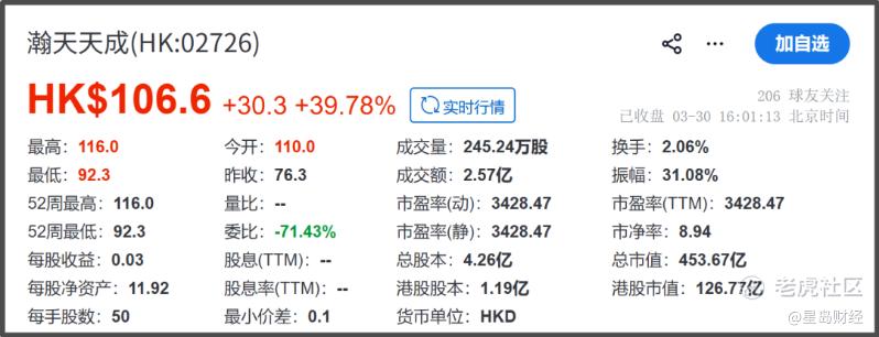3月30日,碳化硅(SiC)龙头瀚天天成(02726.HK)正式登陆香港联交所主板,以110港元/股高开,盘中涨幅一度超405。至当天收盘,报106.6港元/股,较招股价涨39.78%,总市值达453.67亿港元。