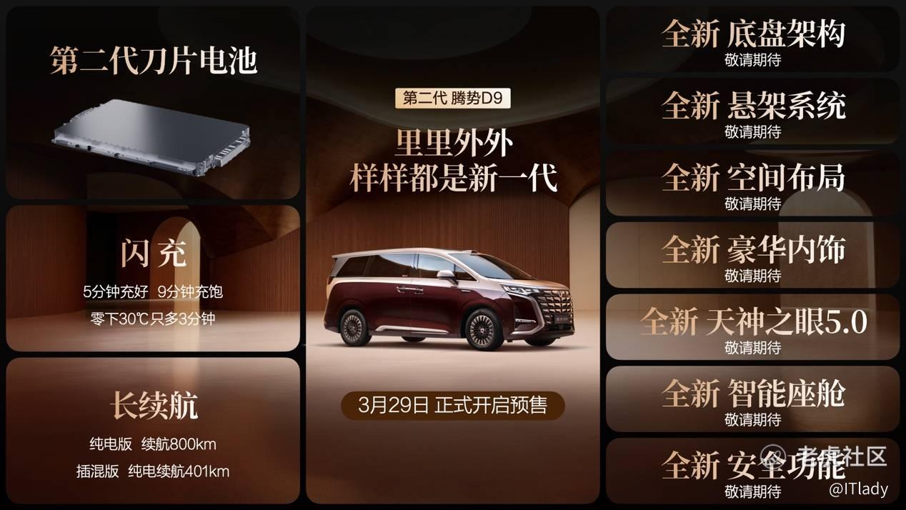 3月29日,备受关注的科技豪华旗舰MPV——第二代腾势D9开启预售,集比亚迪第二代刀片电池、天神之眼 5.0等前瞻科技于一身,在电动、智能、豪华设计等方面全维进化,重塑豪华MPV价值新标杆,堪称时代旗舰,大成之作!