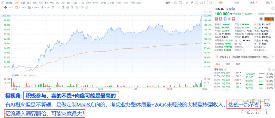 极视角按理来讲属于赌票,但是我给其归类到确定性上,直接上了积极参与的评级,而且肉度高看,最主要的原因就是公司的估值和市值水平,以前跟大家聊过40~60亿市值水平算是机制B时代以来很多公司想入通时的发行市值水平。有的公司是强行拉的这个水平,有的公司是合理或者良心价就这个水平!两者的区别很简单,前者可能失败,后者就算失败了,盘中说不定都冲了入通线的位置,而且还是赚的!极视角我给的就是估值一点都不贵!那这个结论也给的非常自然,没啥下行风险+AI炒作+入通预期,那不就只能梭哈了,首推!