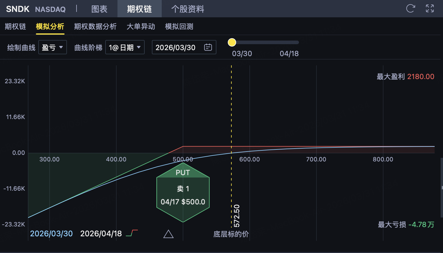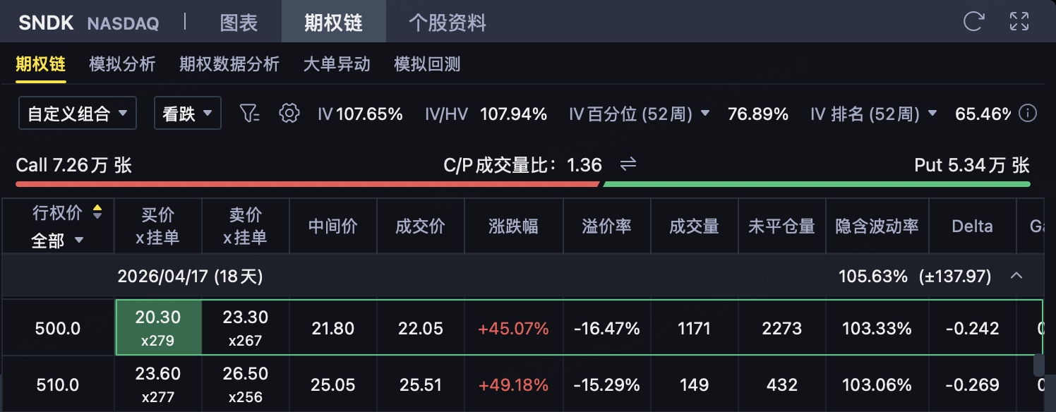 需要特别注意的是,卖Put虽然比卖Call风险有限,但下行风险仍然很大,本质上相当于承诺在500美元买入SNDK,只是先收了一笔21.80美元的权利金。