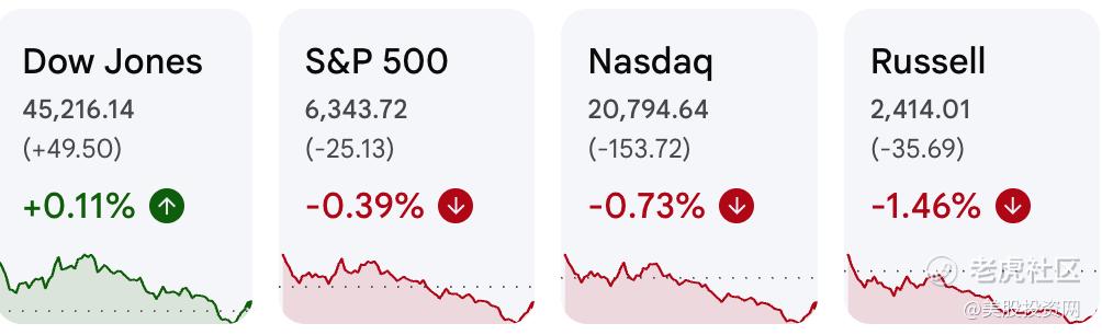 到收盘,道指上涨0.11%;标普500下跌0.39%;纳指下跌0.73%;罗素2000下跌约1.5%。