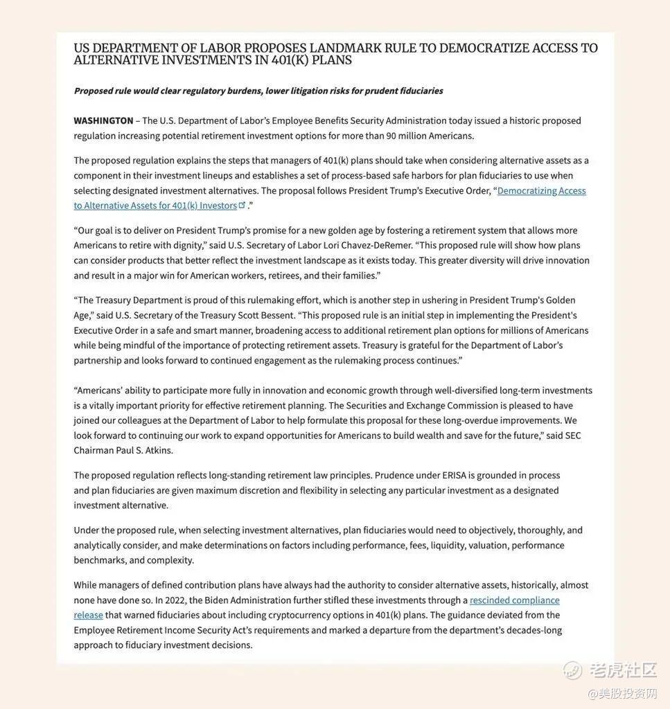 相对亮一点的方向,在金融板块(收涨1.1%)。其核心驱动力来自美国劳工部发布的重磅指引草案——明确受托方可向401(k)退休计划中加入另类资产。(这一政策敞口未来也有望惠及 Bitcoin 等资产)。
