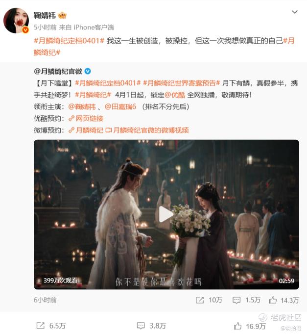 同日,鞠婧祎更新社交动态,转发新剧《月鳞绮纪》相关内容,并配文:我这一生被创造,被操控,但这一次我想做真正的自己。