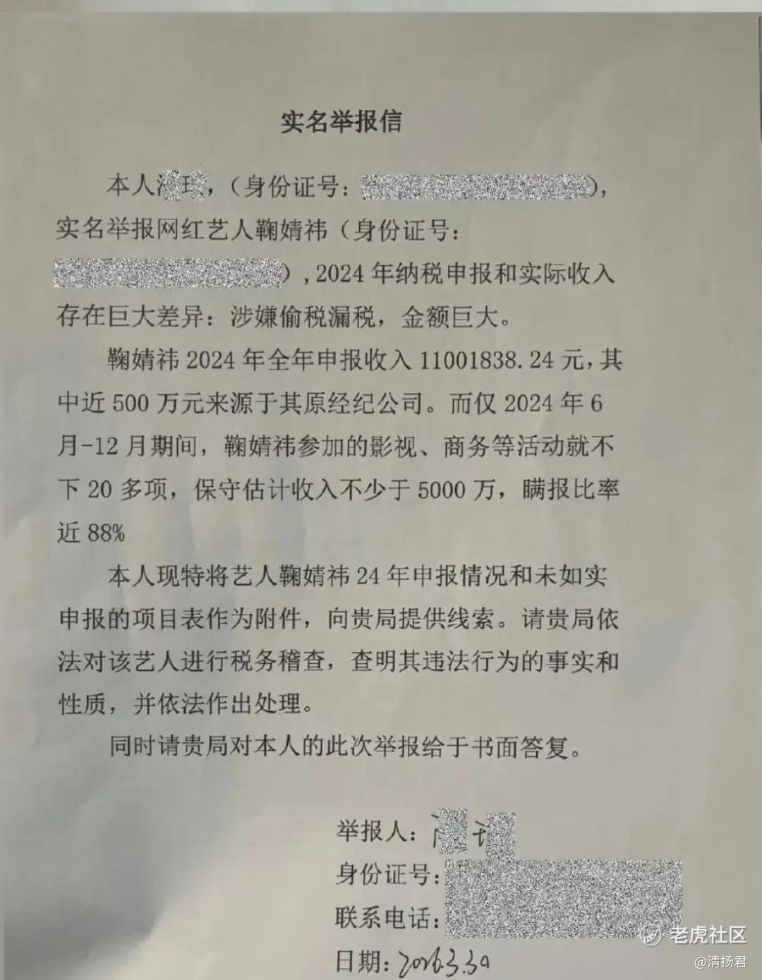 在举报信图片中,举报人称鞠婧祎2024年纳税申报和实际收入存在巨大差异,涉嫌偷税漏税,金额巨大。举报信描述,鞠婧祎2024年申报收入1100万元,实际收入超5000万元,瞒报比例超过85%,即被举报涉嫌偷逃税款约4000万元对应的税额,并附有鞠婧祎2024年申报情况和未如实申报的项目表。