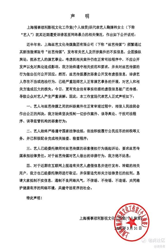 值得注意的是,3月26日,丝芭传媒曾发布声明,否认双方已达成和解。声明中提到,丝芭未曾与任何鞠婧祎方的所谓工作室、工作团队、剧宣团队、网宣团队或任何关联人员、关联组织进行任何方面的洽谈和解事宜,也未与其出演的任何剧集的关联人员、关联组织有任何洽谈或和解。丝芭传媒与鞠婧祎的经纪合约纠纷正在司法审理阶段,双方从未达成任何和解。