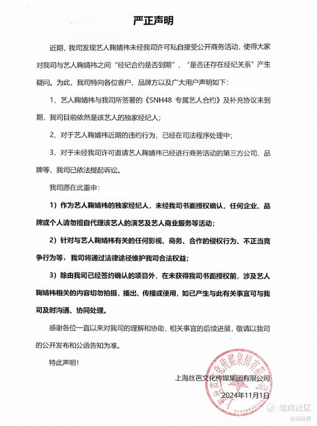 同日中午,鞠婧祎方发布声明。声明中提到,近半年来,上海丝芭文化传媒集团有限公司频繁通过账号丝芭传媒,发布有关艺人及所涉案件的不实信息,企图操控舆论,扼杀艺人的演艺事业。鞠婧祎方控诉丝芭传媒多次发布的信息为虚假信息,意在诽谤艺人存在不当或违法行为完全没有事实依据,导致公众对艺人产生严重误解。