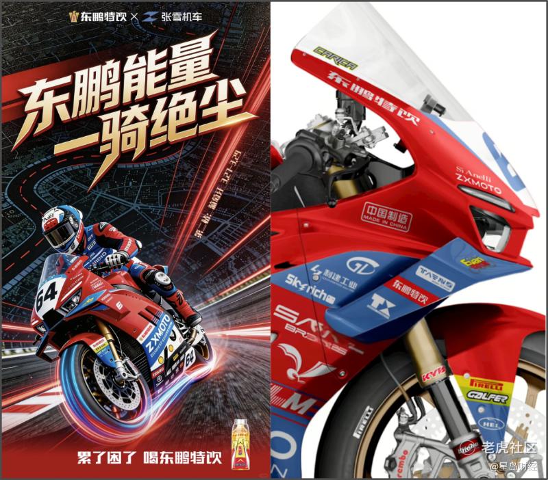 有细心的网友发现,张雪机车的赞助商赫然是一直被贴着“下沉市场”标签的东鹏特饮,而非长期深耕极限运动场景的红牛。