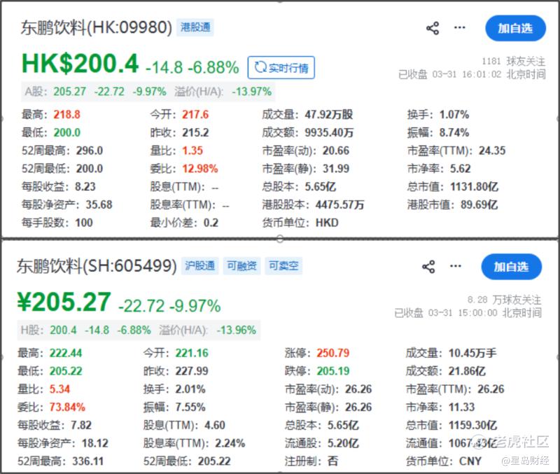 截至3月31日收盘,东鹏饮料A股跌9.97%,报205.27元/股;港股报200.4港元/股,下跌6.88%。