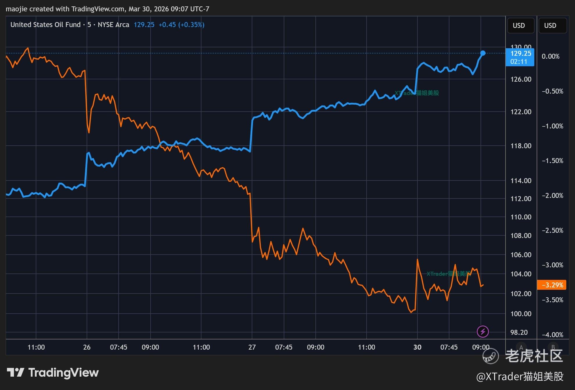 周一美股继续受油价打压,精准负相关关系继续。蓝线为油价,橙线为SPY。