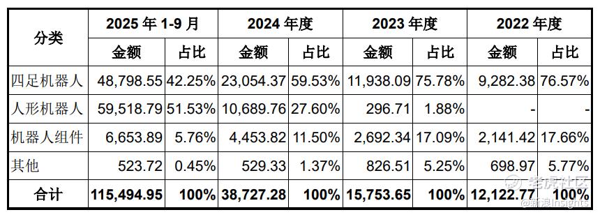 2022年该公司机器人收入全部来自四足产品,人形机器人收入为零。但是,在2025年1-9月,四足机器人收入占比已从2022年的76.57%降至42.25%,金额达4.88亿元。