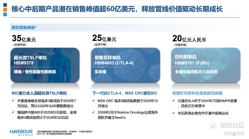 目前,公司拥有近20款候选药物,覆盖从临床前到后期临床阶段的完整研发体系。其核心中后期重磅产品阵营持续扩容,潜在销售峰值已突破60亿美元。