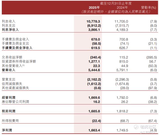 从盈利结构看,利息净收入仍是业绩波动核心因素。2025年该行利息净收入38.66亿元,同比下降7.7%,主要因生息资产利息收入减少9.27亿元,付息负债利息支出减少6.04亿元,收入降幅大于支出降幅。